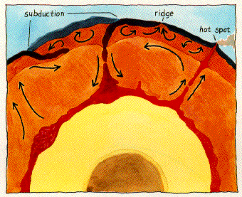 The temperature of the Earth increases with depth. Material is heated at the core and rises up due to it's low density. As it moves up, it spreads out horizontally and makes way for more material to rise. Then it cools and, due to the low density, sinks back to the core. The process repeats over and over EXTREMELY SLOWLY! This could be what drives the plates.